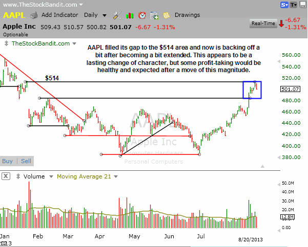 AAPL backed away today, right on cue after filling 95% of the gap to $514 as highlighted here a couple of nights ago. This stock has been very strong but has met a major level and is quite extended after running $125 since it turned higher at the end of June. It now needs rest and I do not see a play here in either direction for this market leader.