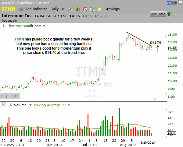 ITMN has attempted to stabilize in the past few sessions and now it wouldn’t take much to see a trend line break if the pullback comes to an end. I like this for a momentum play above $14.70 for Wednesday, but here again a swing setup isn’t real appealing considering the broad market is struggling and upside volume here is still lacking.