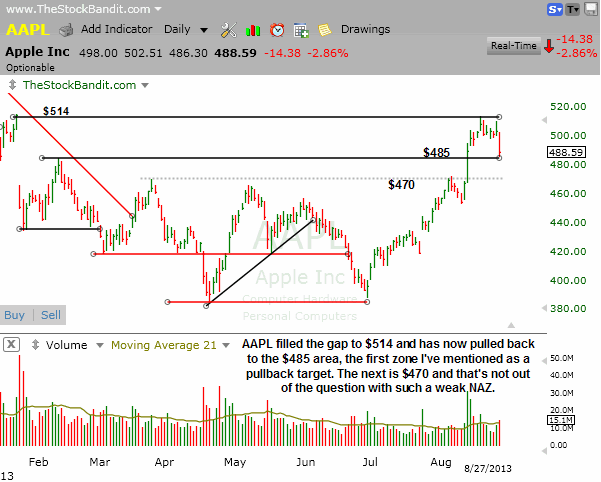 AAPL I noted in last week’s Charts on Demand video that a pullback would provide a better long-sided entry for those looking for one. I specifically noted $485, followed by $470 as downside levels to watch. Today this index reached the first area, but given the weakness in the NASDAQ I certainly wouldn’t count out a quick trip down toward $470. Price had simply become extended and this is part of the process of profit-taking and testing prior levels. Be patient with new buys.