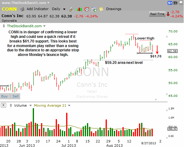 CONN is exhibiting a bit of volatility in the last couple of days but could break support anytime now. If it undercuts $61.70 on Wednesday, I’ll take it for a momentum play on the short side with room toward $50.20. The risk/reward for a swing here just isn’t favorable given the distance to an appropriate stop as compared to next support.
