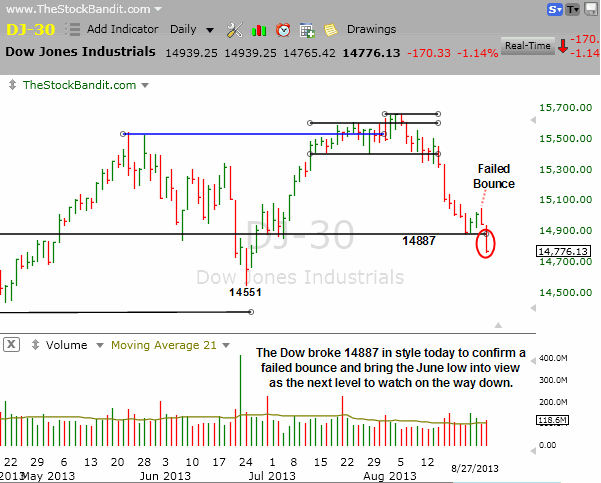 The bulls tucked their tails and ran today after Monday’s failure at resistance (S&P) and subsequent weak finish. As concerns over deteriorating technicals coincided with elevating worry over the Syria situation, the sellers took charge to once again confirm a failed bounce. Strength is still being used for selling into, keeping the correction phase intact.