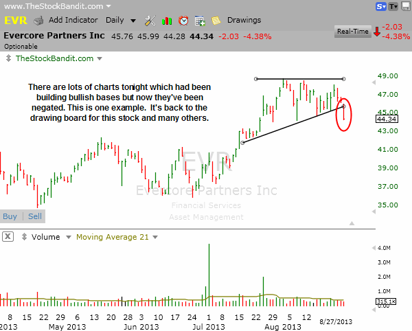 EVR is one failed setup of many tonight as it had been working on a bullish base but today fell out of it. I took no position in this stock, as I rarely will place anticipatory buys and would generally prefer to wait for confirmation of the pattern before entering. Nonetheless, it serves as a good example of what a broken pattern can look like with this change of direction and character now that it’s no longer respecting rising support.
