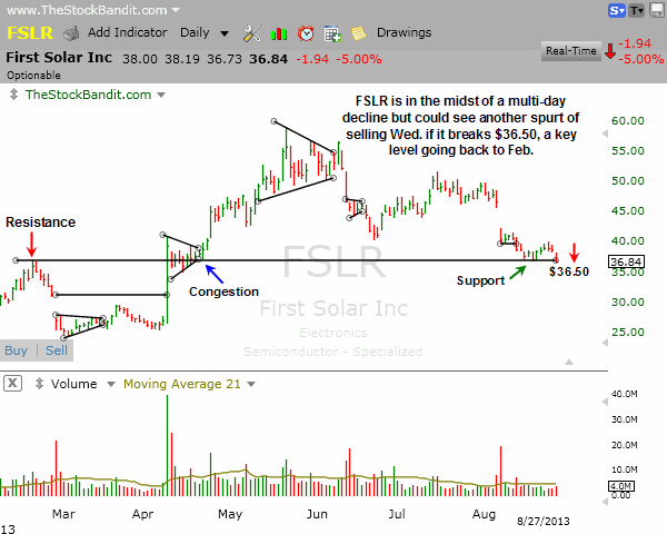 FSLR is already moving lower over the past few sessions so I won’t initiate a swing here since a stop would be so far away. However, it’s coming into a major level here and a breakdown at $36.50 could bring a swift selloff. That interests me for a momentum play on the short side for Wednesday, but this won’t be an overnight hold for me.