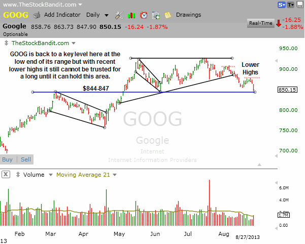 GOOG is at the $844-847 area it has respected as both resistance and support this year. However, with lower highs in place, this area may not hold. Here again, patience with new buys is warranted because this isn’t acting like it’s quite done going lower. Buying solid names on weakness isn’t a bad strategy for longer-term holdings, but getting in the face of downside momentum can be painful. It’s best to wait for some stabilization before considering longs, which would actually mean buying after weakness rather than buying into it.