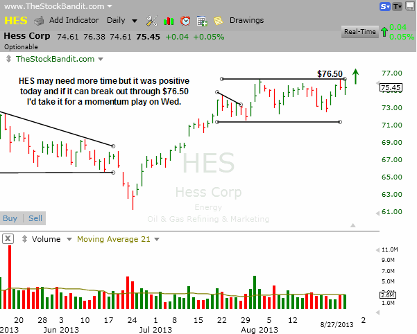 HES is not far from breakout territory and today actually posted a small gain. This would have too wide a stop for a swing at the moment but some high-level basing within the channel would create a tighter swing stop should it happen to move laterally here. Should it happen to clear $76.50 on Wednesday, I’ll instead just look to participate in the initial breakout move and aim to be out by the closing bell.