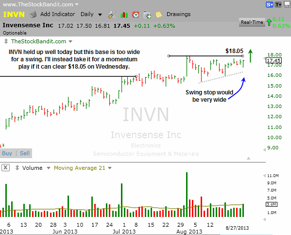 INVN is also sitting near highs and a breakout through $18.05 looks good for a momentum play for Wed. Here again, a swing stop is just too wide given the current base, so this is not an overnight candidate for me. You take what you can get in this kind of a market.