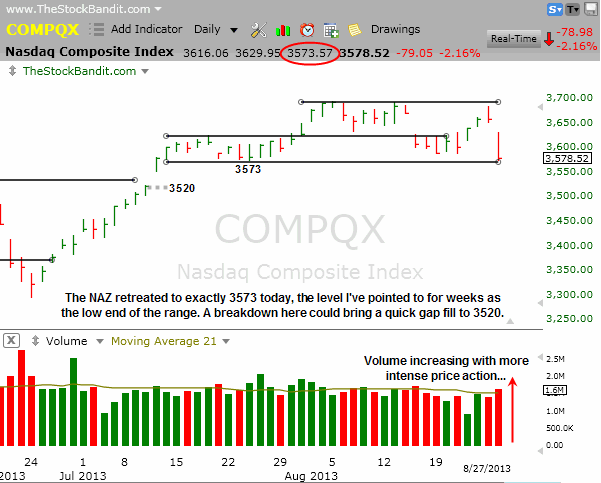 NAZ – The NAZ gapped lower today and continued to sell off right to the 3573 level I’ve been highlighting since July. It managed a tiny bounce from there but looks vulnerable to a break considering the relentless selling today. Should it get broken, next stop is the 3520 gap from mid July. A breakdown would also imply a measured move back down toward 3452, or 121 points lower, which is the height of this multi-week trading range between 3573 and the August high at 3694.