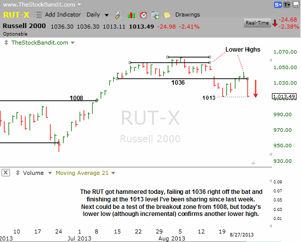 RUT – The RUT erased a week of upside with a single day of weakness today, which is just a reminder that in general we tend to see steady strength with panic usually happening on the downside. It made an incremental lower low, but tonight sits at 1013, which is the August low. A break there and we could quickly see a test of 1008 from the July breakout through the May high. Either way, this index remains in correction mode after today’s confirmation of another lower high.