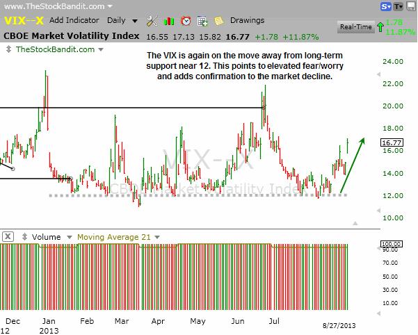 VIX – The Volatility Index spiked today to make a new multi-week high. This index is nowhere near historically important levels, the first of which would be 20, a level we’ve only seen cleared on a few sessions this year. The key though is the direction it’s heading, as this implies growing worry/fear and that confirms the price action we’re getting in the S&P.