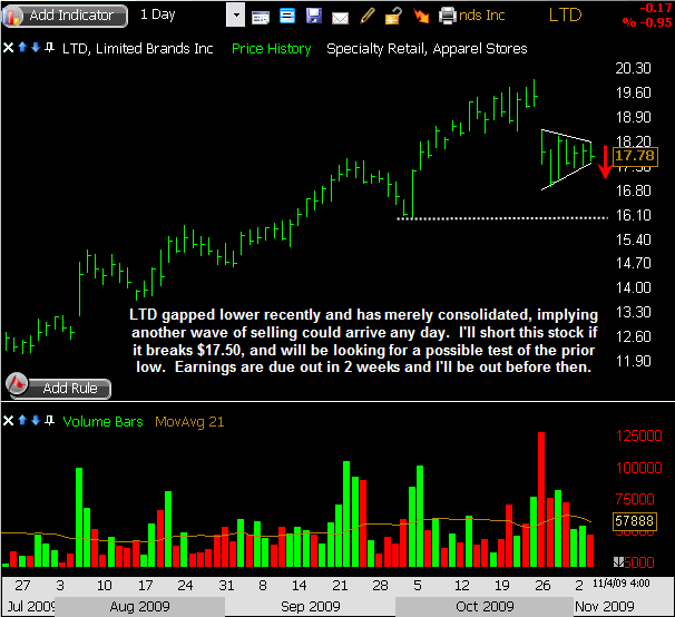 LTD turned lower last week and has only been able to consolidate. Earnings are due out in 2 weeks, so this one still has time to head lower out of this resting phase and possibly test the prior low. I’ll be shorting this one if it moves down through $17.50.