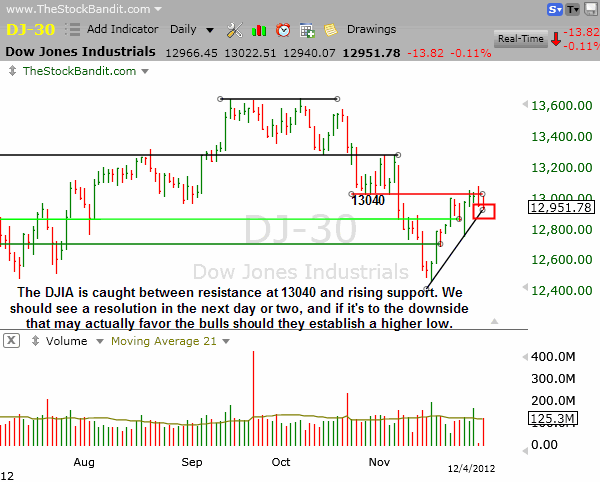 DJIA – The DJIA has thus far failed to reclaim 13040 and now is getting wedged between that level and the uptrend line. The next pullback, whenever it arrives, has a fair shot at resulting in a higher low, but the key will be the character of the pullback and whether the bulls are committed to stepping in ahead of the November low with bids to support price.