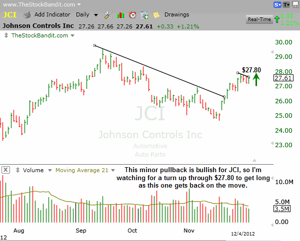 JCI is setting up for another leg higher here after a few days of rest with this minor pullback. A turn up through the trend line at $27.80 will trigger a buy for me as the recovery continues for this stock.