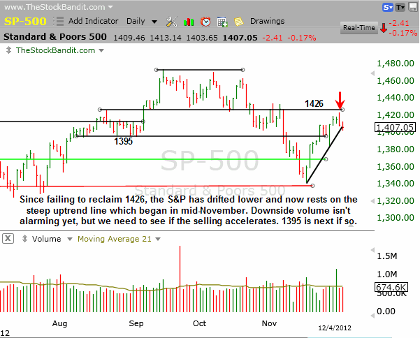 SP500 – The S&P finished lower again today, but only by a couple points. That’s not bad given Monday’s downside reversal, but the focal point for this index is also the steep uptrend line from the November low. Next support is 1395.