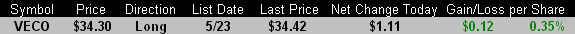 VECO triggered a buy today as it cleared the descending trend line at $34.30. With an afternoon trigger, it didn’t have a lot of time to run but it did finish at its highs of the session. Volume left a little to be desired, however, as it perked up slightly but was nothing significant. I’d like to see that change in the days ahead as this one attempts to follow through on today’s lift, so I’ll be watching it closely. I’m leaving my stop as-is heading into Wednesday’s session.