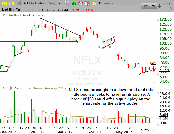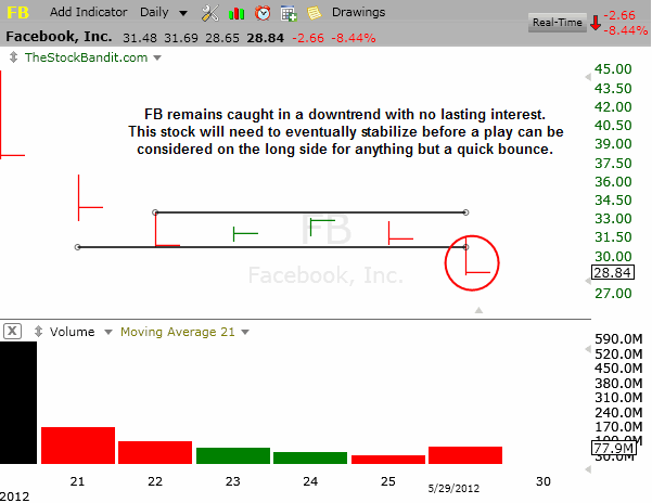 FB remains a focal point right now as a barometer of interest from the casual investor given all the recent attention. Last night I pointed out the $31 area as short-term support with a bear flag pattern, and today we saw a very clean breakdown in the stock which offered some easy gains for active traders on the short side. This stock continues to seek support at lower levels, even having shed nearly $10 from its IPO pricing.