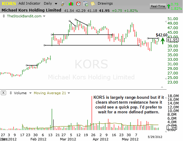 KORS is trying to move higher within its intermediate-term trading range, and is facing some short-term resistance here.