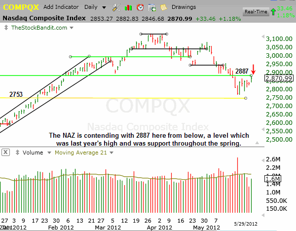 NAZ – The NAZ challenged 2887 today but has yet to clear it. This index posted a gain but finished off its intraday high, leaving it short-term range-bound.