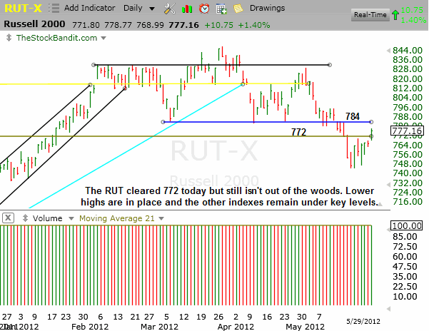 RUT – The RUT was able to clear 772 today, making 784 the next level to keep an eye on if we see additional strength. However, this index will likely need some assistance from the others if it is to continue recovering.