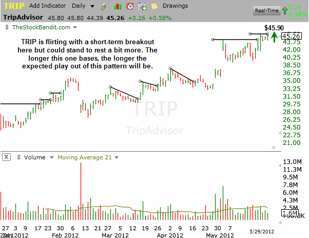 TRIP has held above resistance since clearing it last week, creating a mini-base here. This stock is holding up extremely well and may move higher in the near term, although this is not a swing pattern given its size.
