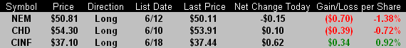 NEM struggled to hold up today as cash moved out of the gold sector and into other groups. It didn’t lose much ground, however, which is somewhat encouraging, as was the light volume which came with the minor pullback. I’m sticking with this trade for now while waiting to see how it acts on the next lift.