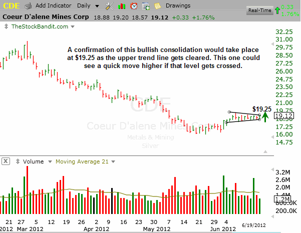 CDE is challenging a trend line here and could get through it as soon as tomorrow. This one could see a nice lift if it gets through $19.25, but this stock hasn’t proven its change of direction yet so I’m reluctant to take it for a swing.