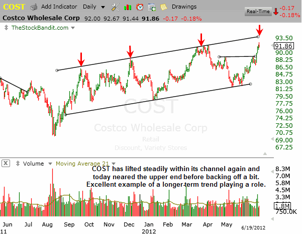 COST neared the upper end of the channel today and then backed off. It’s important to keep longer-term patterns like this in mind as cues to lighten up even if your timeframe for a trade is shorter-term.
