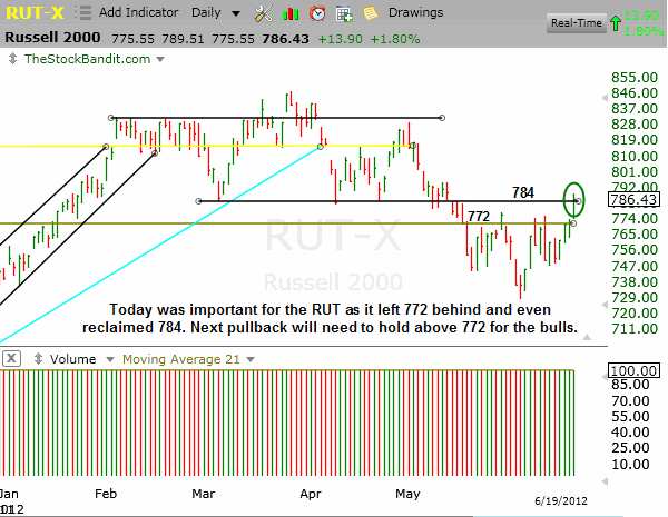 RUT – The RUT has cleared 2 big levels in 2 days at 772 and 784, respectively. This has been a nice multi-day run for small caps, so if we see some rest at this point it wouldn’t be a bad thing. Bulls would ideally see 772 held on the next dip though.
