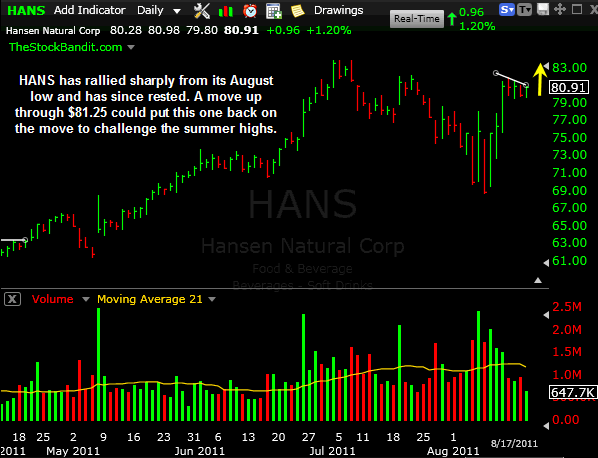 HANS is acting well with a recent rally and a few days of rest. This has created a tight bullish consolidation, and the stock may soon get back on the move. Although some resistance isn’t far overhead, the buyers remain in control of this one (note all the biggest spikes in volume have come on advances in recent months). I’ll get long if this one clears $81.25 with a stop just beneath short-term support. As with all swing trades, my stop and target levels for this stock are on the Hit List here inside the Hideout.