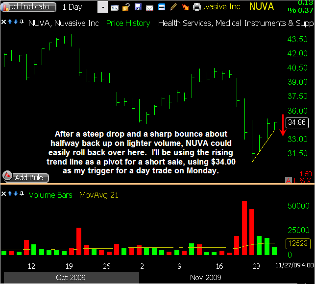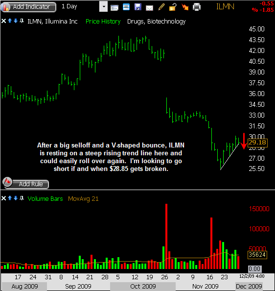 ILMN has exhibited considerable weakness lately, and in the past few days it has bounced rather sharply. The bounce has created a V-shaped move, as well as a steep rising trend line which price is now starting to lean on. A move down through the trend line will be the next technical sell point, so I’m watching this one for a play on the short side if and when it undercuts $28.85.